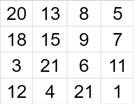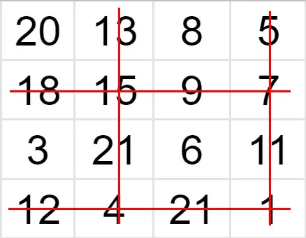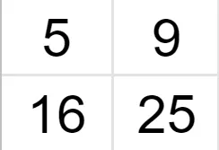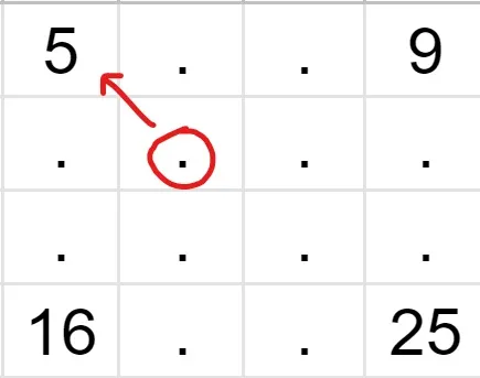 Let’s find the intensity of the pixel in the red circle. As you can see, its nearest neighbor with a known value is 5, so the value of the unknown pixel is also 5. In a similar fashion, we fill in the rest of the grid, and receive a 4x4 image.