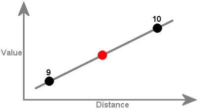 In Linear interpolation, we find the unknown value using the weighted average of its neighbors.