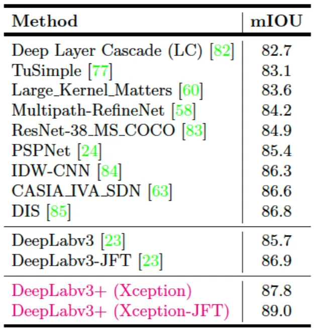 As seen above, DeepLabv3+ surpasses various SOTA techniques, including LC, ResNet-DUC-HDC (TuSimple), GCN (Large Kernel Matters), RefineNet, ResNet-38, PSPNet, IDW-CNN, SDN, DIS, and DeepLabv3.