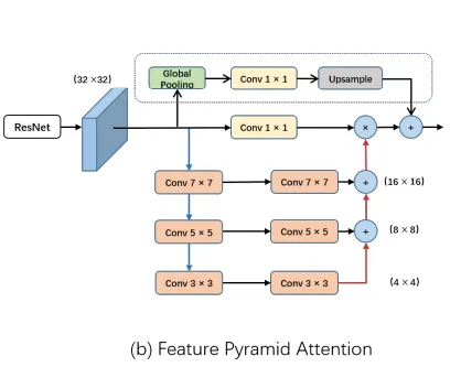 The pyramid attention module fuses features from under three different pyramid scales. Here they use three convolutions (7X7, 5X5, 3X3) to extract the context. We can see that the original feature is multiplied by the pyramid attention features after passing through a 1X1 convolution. Benefiting from spatial pyramid structure, the Feature Pyramid Attention module can fuse information from different scale contexts and produce better pixel-level attention for high-level feature maps.