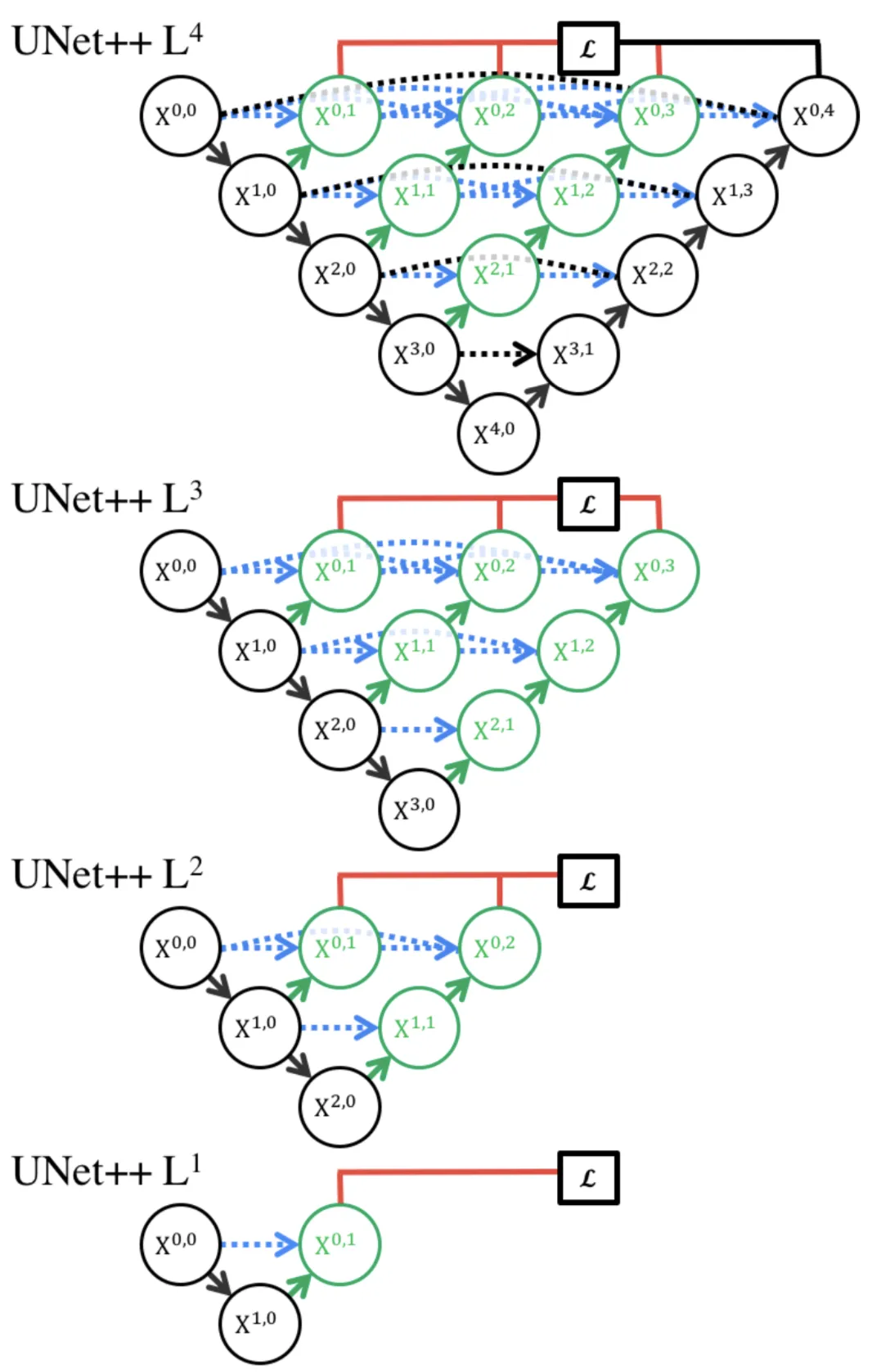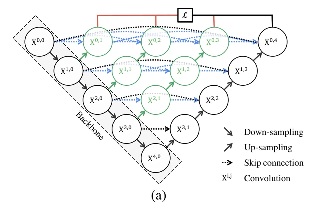 UNet++ starts with an encoder sub-network or backbone and then continues on to a decoder sub-network. The re-designed skip pathways (shown in green and blue) that connect the two sub-networks, as well as the use of deep supervision (shown red), separate UNet++ from UNet (black components).