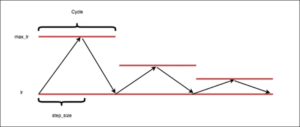 - Triangular - in this method, we start training at the base learning rate and then increase it until the maximum learning rate is reached. After that, we decrease the learning rate back to the base value. Increasing and decreasing the learning rate from min to max and back take half a cycle each.