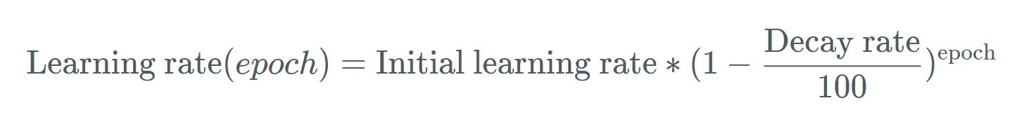 - Gamma - a multiplicative factor by which the learning rate is decayed every epoch. For instance, if the learning rate is 1000 and gamma is 0.5, the new learning rate will be 1000 x 0.5 = 500.