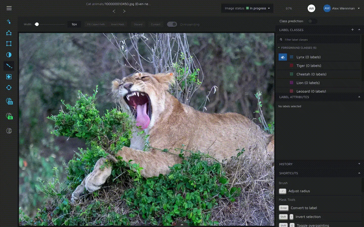 The Brush and the eraser tools are used to create (using the brush) and remove (using the eraser) masks or to edit masks. Masks is what we we call shapes that are more complex than polygons and bounding boxes. A mask is set on a pixel-level, and is used for when you need pixel-perfect level annotations.