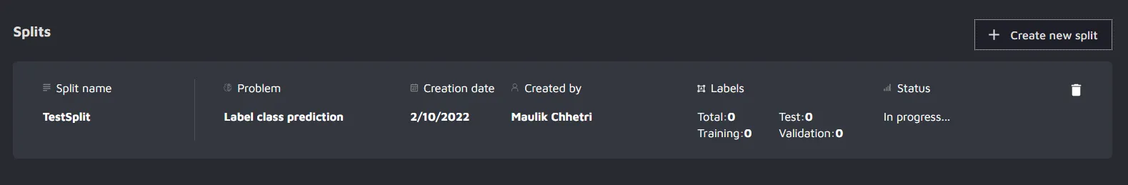 This page essentially gives an overview of the various splits already tried when a user enters the model building phase after data annotation and quality control steps.
