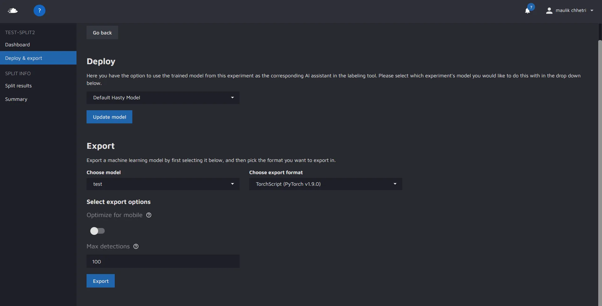 In the export section, you can choose which experiment you would like to export the model from, and in what format.