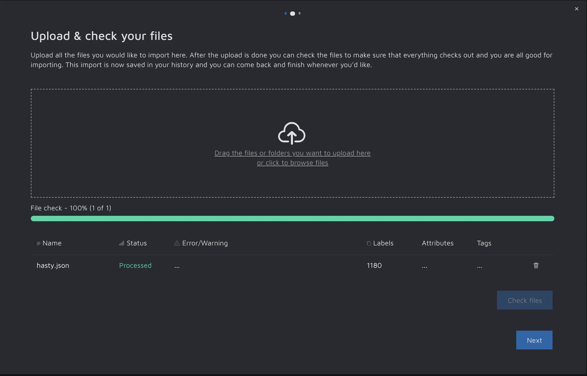 On the next screen, you can upload files. Here, we have uploaded a JSON. After you've uploaded your files, click "Check files". This will parse your files and check that they can be imported. If your file(s) are compatible, you will see a summary of the number of labels/attributes/tags you are about to import. Double-check those numbers to make sure that you are not importing data you don't want into the project.